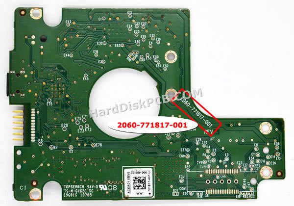 “PCB 번호”는 2060-771817-001. 웨스턴디지털 하드 드라이브의 “PCB 번호”는 “2060-***”으로 시작하며 번호는 보드에 인쇄되어 있습니다. 보드를 교체하려면 기증자 보드에 원래 보드와 동일한 “PCB 번호”가 있어야 합니다.웨스턴디지털 하드디스크 PCB기판 교체